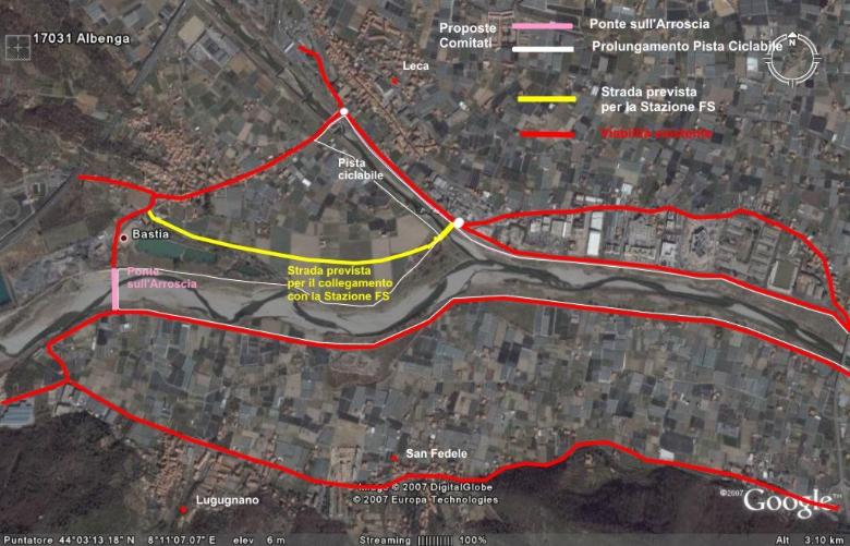 Vorremmo proporre alla vostra attenzione la fattibilità e priorità delle seguenti opere che nei prossimi anni dovranno essere avviate nel nostro territorio. Chiediamo il vostro parere su quale di queste è prioritaria. Per meglio rendere l'idea abbiamo deciso con l'aiuto di Google Earth di mostrarvi le seguenti foto. Con il colorare "Rosa" il ponte nuovo sul fiume Arroscia da noi classificato come prioritario, rispetto al ponte "Giallo" sul Neva dove ne è già presente uno sicuramente migliorabile, entrambi porterebbero alla futura stazione in Bastia , qual'è la vostra idea?